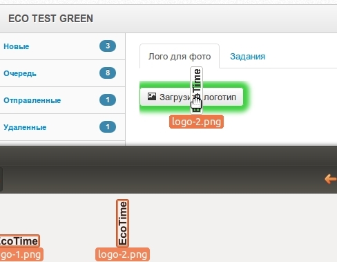 Перед тем как наложить логотип, его нужно загрузить на сервер Ecotime, сделать это можно во вкладке "Настройки" > "Лого для фото", далее “загрузить логотип” или перетащите логотипы на кнопку. Можно загрузить несколько различных логотипом и накладывать их по необходимости, формат логотипов должен быть “PNG” . Не забудьте сохранить загруженные логотипы.