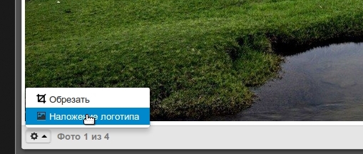 Для непосредственного наложения логотипа, нужно открыть в уже созданном посте фотографию, после чего слева внизу кликните по шестеренке и выберите ‘наложение логотипа’.